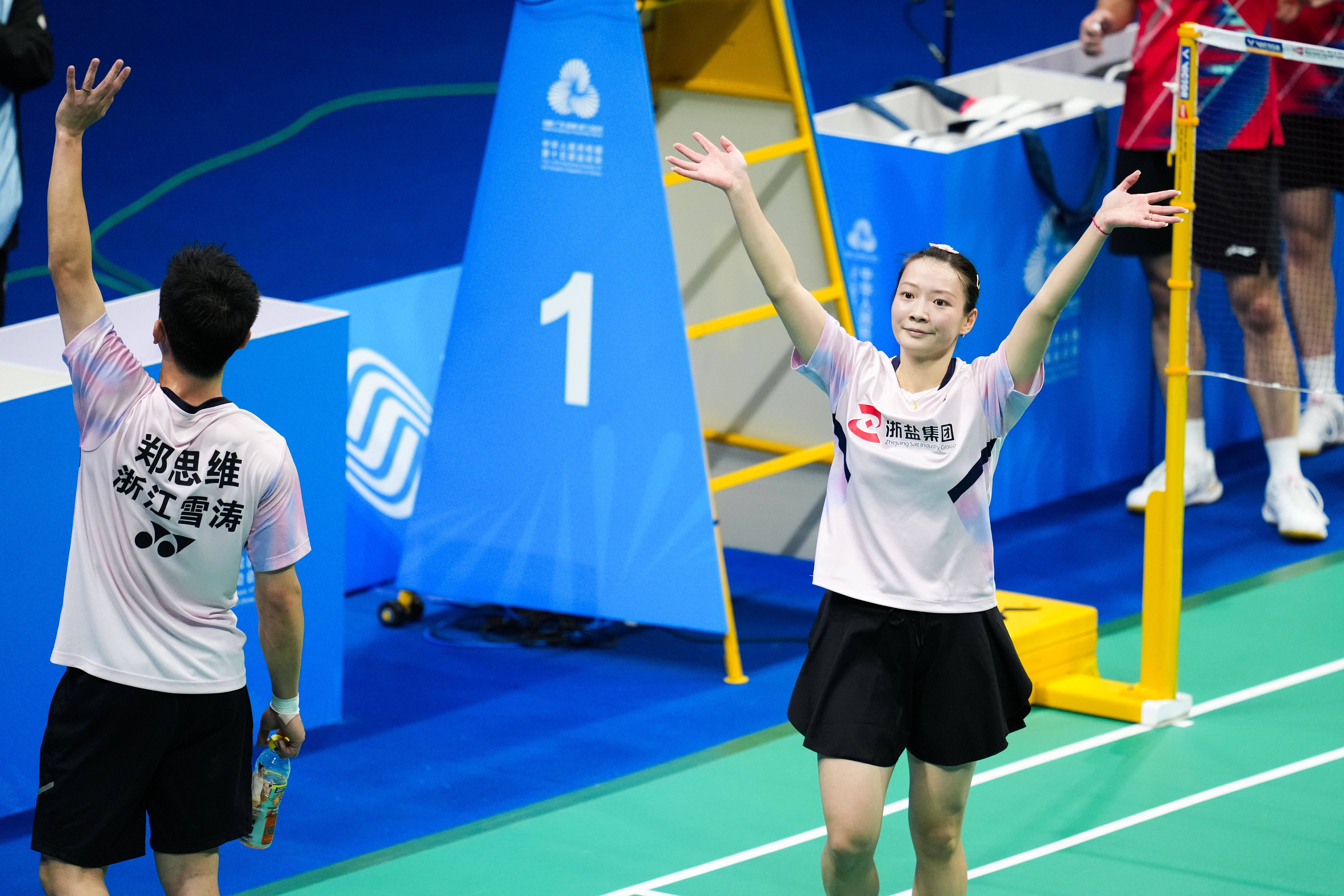 2025年11月20日,郑念念维/黄雅琼(右)在夺冠后向不雅众问候。新华社记者 陈念念汗 摄