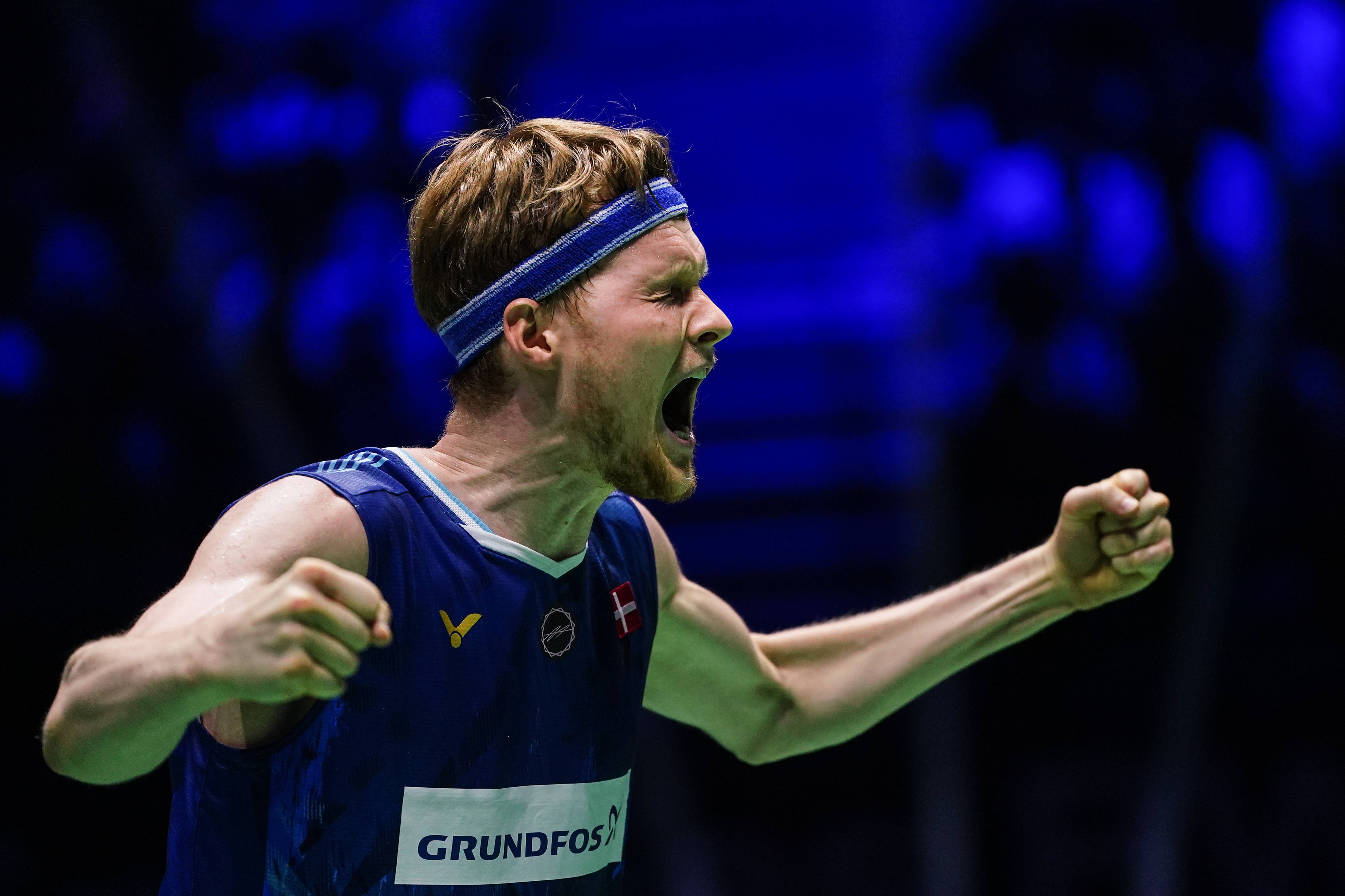 丹麦选手安东森在晋级2025年羽毛球世锦赛须眉单打四强后庆祝。新华社记者 彭子洋 摄