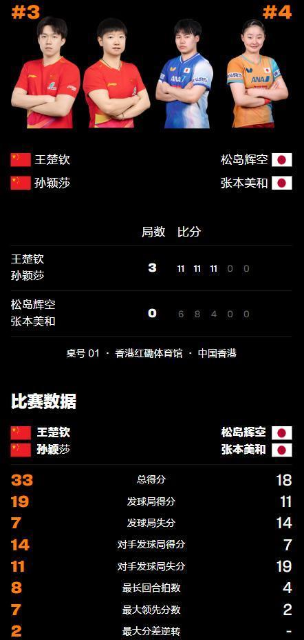 2025年WTT香港总决赛,国乒在混双赛场派出了王楚钦/孙颖莎和林诗栋/蒯曼两大王牌组合出征,小组赛阶段莎头组合发达骁勇,三战全胜锁定小组第一,抬头闯入到了混双四强。 这一个比赛日,王楚钦/孙颖莎迎来了半决赛的磨练,对阵日本组合松岛辉空/张本好意思和,本场比赛莎头组合展现出了更胜一筹的实力,三局比赛紧紧掌控着处所,最终以大比分3-0横扫得胜,晋级混双决赛。 ![]() 松岛辉空/张本好意思和固然年齿王人不大,然则二东说念主单打和双打的实力王人迥殊强,其中混双寰球名次高居第四,不外面临生活也曾斩获开阔荣誉的莎头组合,松岛辉空/张本好意思和在实力和劝诫上王人处于下风,这亦然赛前球迷更看好王楚钦/孙颖莎晋级远景的原因。 这一场比赛是王楚钦和松岛辉空在本届总决赛的第二次交手,男单首轮大头在绝境中爆发,履历七局鏖战逆转了松岛辉空,赛后日本小将也泪洒现场,如今再度见面,王楚钦能否在单打和双打赛场双杀松岛辉空,也就成为了此战最大的看点。 ![]() 此前有过交手的两对组合,首局一上来就插足到了肉搏战,你追我赶一直打到了3平,比分胶著时间,莎头组合当先发力,孙颖莎高质料的接发球劈长,给王楚钦创造出了径直侧身爆冲的契机,大头也莫得让搭档失望,靠着霸气豪阔的脱手,相接打穿张本好意思和,徐徐设立起了7-4的卓绝,而且一饱读作气以11-6先拔头筹。 松岛辉空/张本好意思和第二局加多了我方发球的变化,开局也遂愿设立起了2-0的卓绝,不外在王楚钦/孙颖莎加强我方回球的旋转后,日本组合衔尾第二板的质料彰着下滑,惟有出现契机,闭幕才智极强的王楚钦和孙颖莎,王人概况一剑封喉完成得分,在回敬一波5-0后,莎头组合中局将比分反超为了5-2,固然松岛辉空/张本好意思和莫得排除,一度抹平了分差,但王楚钦/孙颖莎再度发力从头赢得卓绝,以11-8再赢一局。 ![]() 在我方的赛点局,王楚钦/孙颖莎一上来就打出了高质料的相接弥留,强势设立起了3-0的卓绝,不外接下来二东说念主相接出现子虚,让松岛辉空/张本好意思和收拢了契机,连得4分将比分反超为了4-3,好在莎头组合实时找回了现象,从头夺回主动权后,回敬一波流把比分改写为了7-4。 固然日本王牌混双武断叫了一个暂停,但莫得太大的成果,再次回到赛场之后,王楚钦/孙颖莎仍然紧紧掌控着处所,最终以11-4锁定胜局。 ![]() 【本场数据】 ![]() 在稍早前铁心的一场混双半决赛中,寰球名交替一的林诗栋/蒯曼爆冷输给了韩国组合林仲勋/申裕斌,跟着王楚钦/孙颖莎赢下这一场中日对决的告捷,他们抬头晋级决赛,将会和寰球名交替二的韩国王牌争夺冠军。 #体育最前哨# 陌上花开谈体育优质体育范围创作家24843篇原独创报/反应","del":0,"gnid":"94ed39778a9422576","img_data":[{"flag":"2","img":[{"desc":"","height":"759","title":"","url":"http://p9.img.360kuai.com/t11508c75c8cb8c62f96889115b.jpg","width":"1022"},{"desc":"","height":"767","title":"","url":"http://p9.img.360kuai.com/t11508c75c8220c6a95bc965f78.jpg","width":"1081"},{"desc":"","height":"763","title":"","url":"http://p9.img.360kuai.com/t11508c75c890398bc044ecb84f.jpg","width":"981"},{"desc":"","height":"738","title":"","url":"http://p9.img.360kuai.com/t11508c75c8db3ed06d97730a37.jpg","width":"1198"},{"desc":"","height":"928","title":"","url":"http://p9.img.360kuai.com/t11508c75c87e8eadcad8f1bb28.jpg","width":"442"},{"desc":"","height":"200","title":"","url":"http://p9.img.360kuai.com/t11508c75c8929fa99e15d6eff9.jpg","width":"200"}]}],"original":0,"pat":"art_src_6,fts0,sts0","powerby":"cache","pub_time":1765608480000,"pure":"","rawurl":"http://zm.news.so.com/3c9caca02c7fd35ede49031edaf4d9f7","redirect":0,"rptid":"c2af255b248efd4f","rss_ext":[],"s":"t","src":"陌上花开谈体育","tag":[{"clk":"ksport_1:王楚钦","k":"王楚钦","u":""},{"clk":"ksport_1:孙颖莎","k":"孙颖莎","u":""}],"title":"王楚钦双杀松岛辉空,莎头组合3-0横扫日本王牌,决赛对阵寰球第2","type":"zmt","wapurl":"http://zm.news.so.com/3c9caca02c7fd35ede49031edaf4d9f7","ytag":"体育:乒球","zmt":{"brand":{},"cert":"体育范围创作家","desc":"足球、篮球范围商量和探讨!","fans_num":0,"id":"2562537634","is_brand":"0","name":"陌上花开谈体育","new_verify":"7","pic":"https://p4.img.360kuai.com/t01c2d6ff0cc32b4821.jpg","real":1,"textimg":"https://p9.img.360kuai.com/bl/0_3/t017c4d51e87f46986f.png","verify":"0"},"zmt_status":0}","errmsg":"","errno":0}